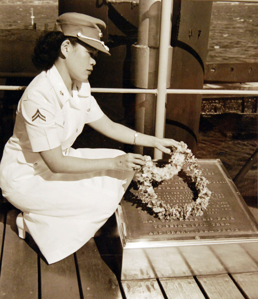 Pearl Harbor, Hawaii. Corporal Evangeline Lyau, USMC, places wreath on plaque aboard the remains of USS Arizona (BB-39), commemorating 10th Anniversary of Attack on Pearl Harbor, December 7, 1951