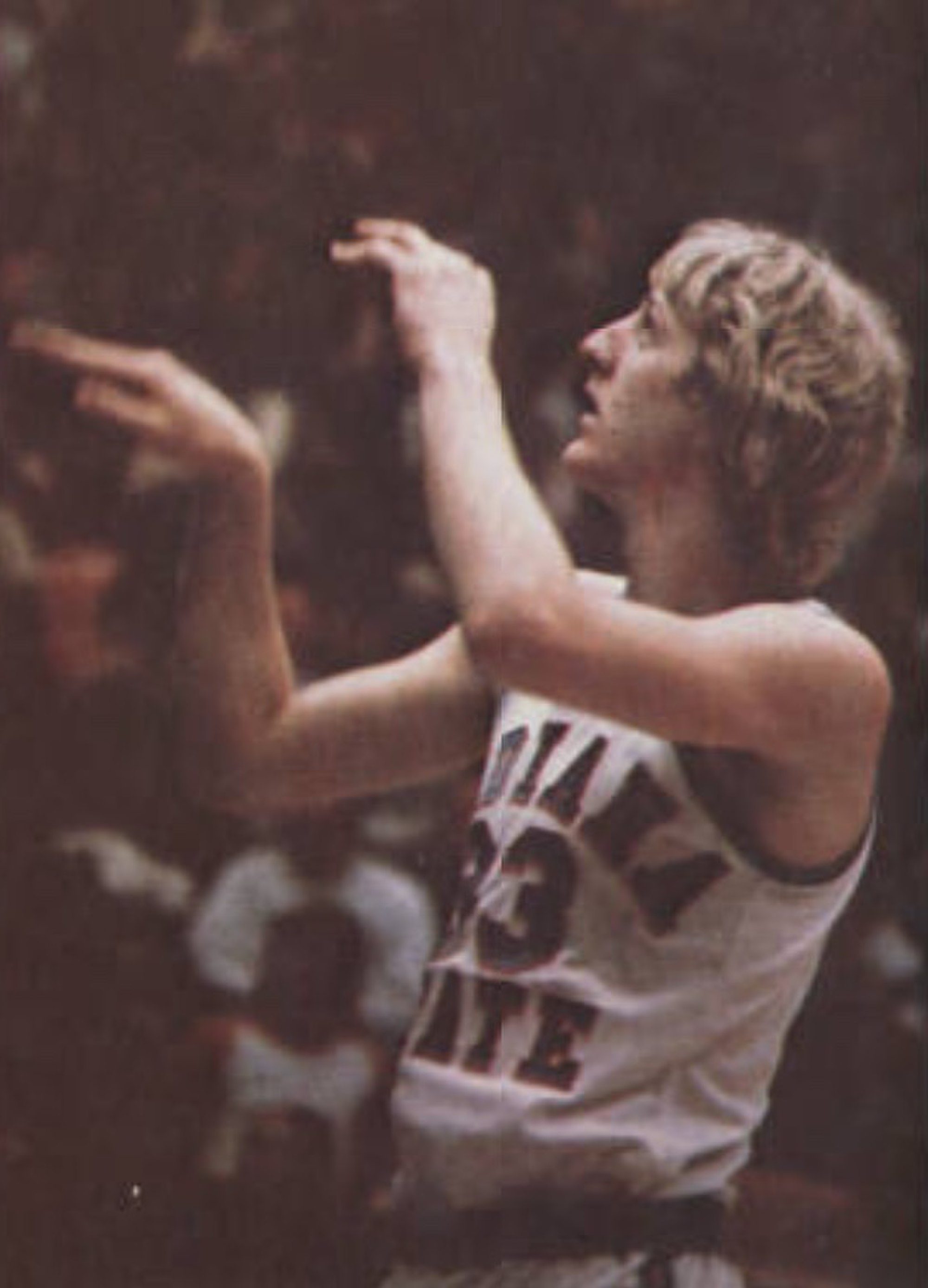 Pro basketball legend Larry Bird was born on December 7, 1956 in French Lick, Indiana. Image of Bird while a player at Indiana State in 1977 via Wikimedia Commons, no known restrictions