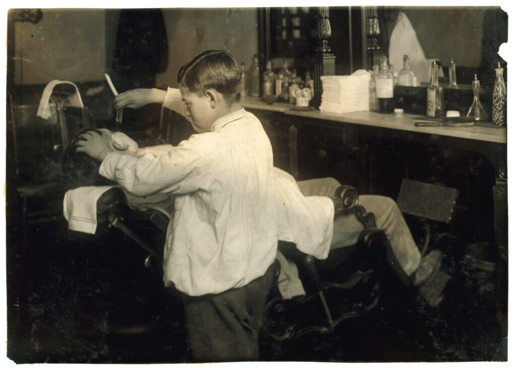 Frank De Natale, age 12, gives a customer a shave in his father’s barbershop at 416 Hanover Street in Boston’s North End. He worked after school and on Saturdays. Photographed by Lewis Hine on February 1, 1917.