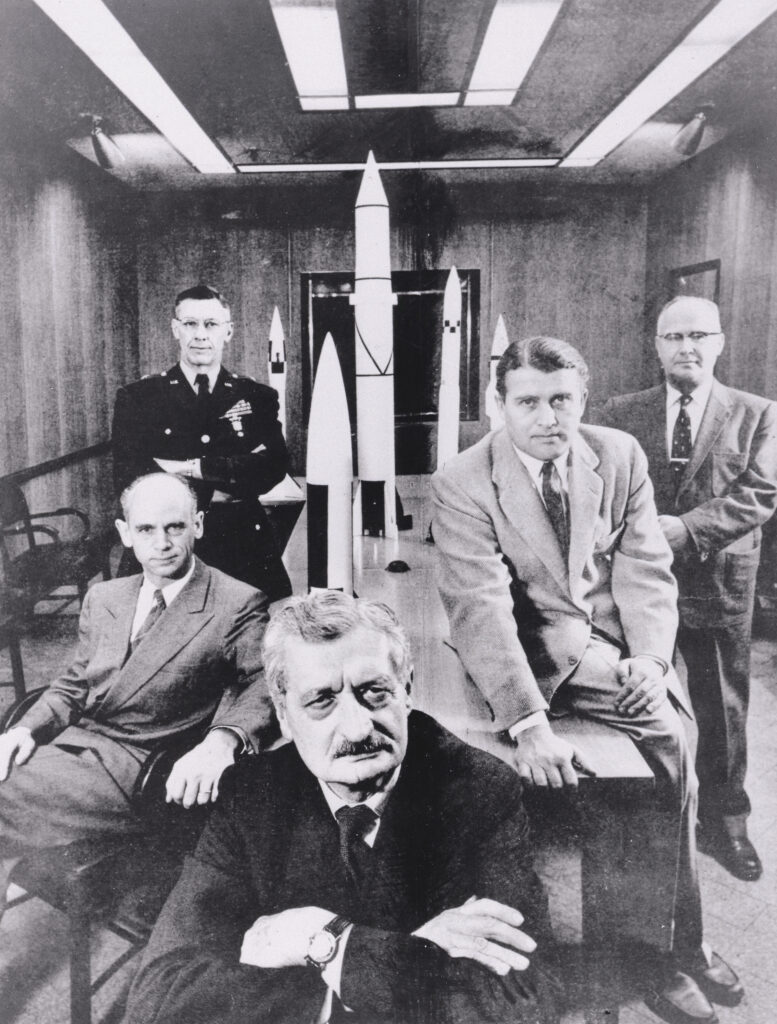 February 1, 1956. Five architects of America’s early missile program pose with scale models of the rockets they helped create: Dr. Ernst Stuhlinger, Major General Holger Toftoy, Professor Hermann Oberth, Dr. Wernher von Braun, and Dr. Robert Lusser. Photographed by Hank Walker for Life magazine at Patrick Air Force Base in Florida—where the Army conducted missile tests—the image captures the core ABMA team that would soon relocate to Huntsville and form the nucleus of NASA’s Marshall Space Flight Center, the group that ultimately designed the Saturn V that carried Apollo astronauts to the Moon.