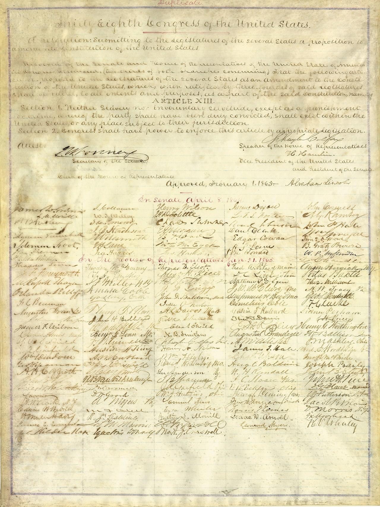 On February 1, 1865 Abraham Lincoln inscribed “Approved” next to his signature on the 13th Amendment which abolished slavery in the United States. Illinois was the first state to ratify the amendment on the same date.