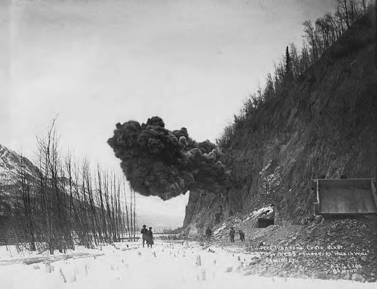 Cloud of smoke from exploding dynamite at Hole-in-Wall bluffs above Matanuska River, Alaska, February 10, 1917. via Wikimedia Commons, public domain –>