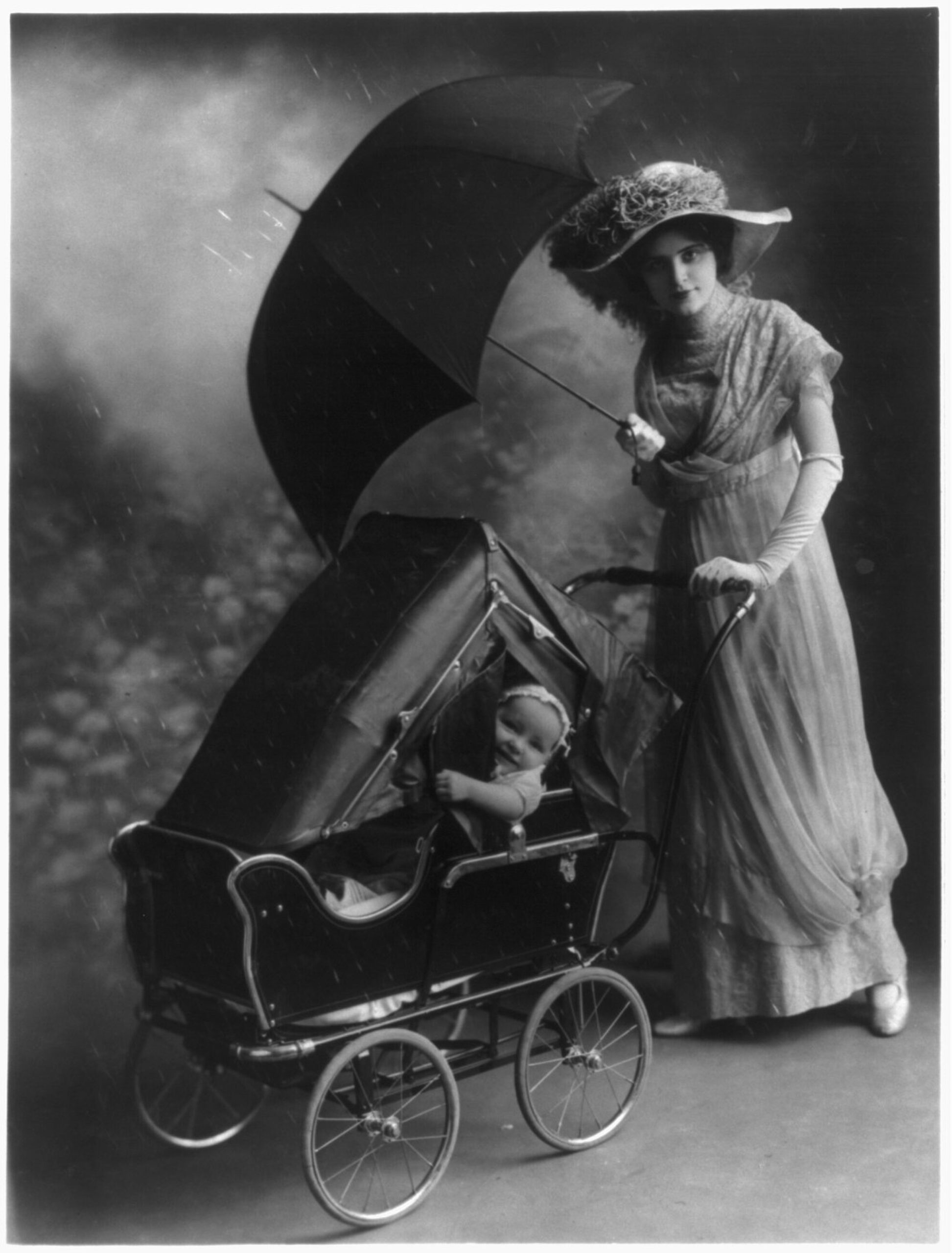 Woman, holding umbrella, pushing baby in carriage equipped with rain cover c. 1913 Happy National Umbrella Day! Image via Wikimedia Commons, public domain –>
