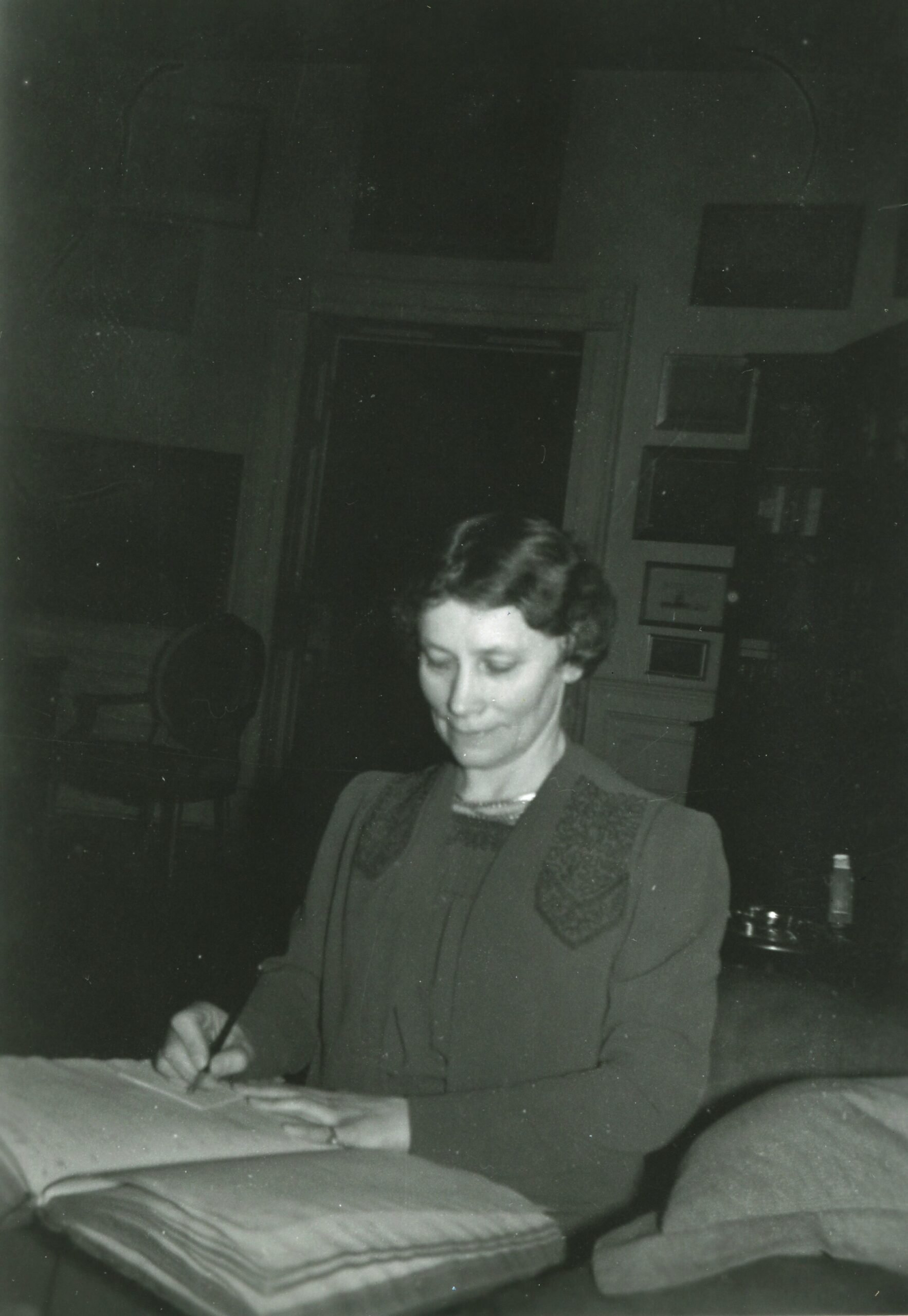 A photo taken by FDR of Margaret “Daisy” Suckley on February 10, 1942. Daisy was FDR’s sixth cousin who he hired to work as the FDR Library Archivist in 1941. She worked there until 1963. Image from FDR Presidential Library & Museum via Wikimedia Commons, CC BY 2.0 –>