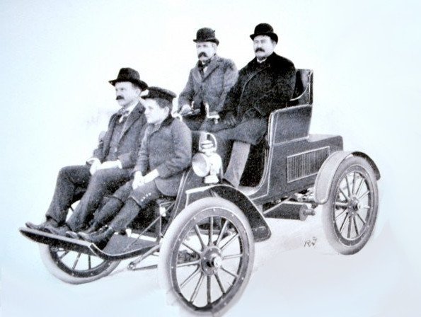 John William Lambert (who had more than 600 inventions) and his brothers in a Union Car Company automobile Image dated February 10, 1902 Image via Wikimedia Commons, public domain –>