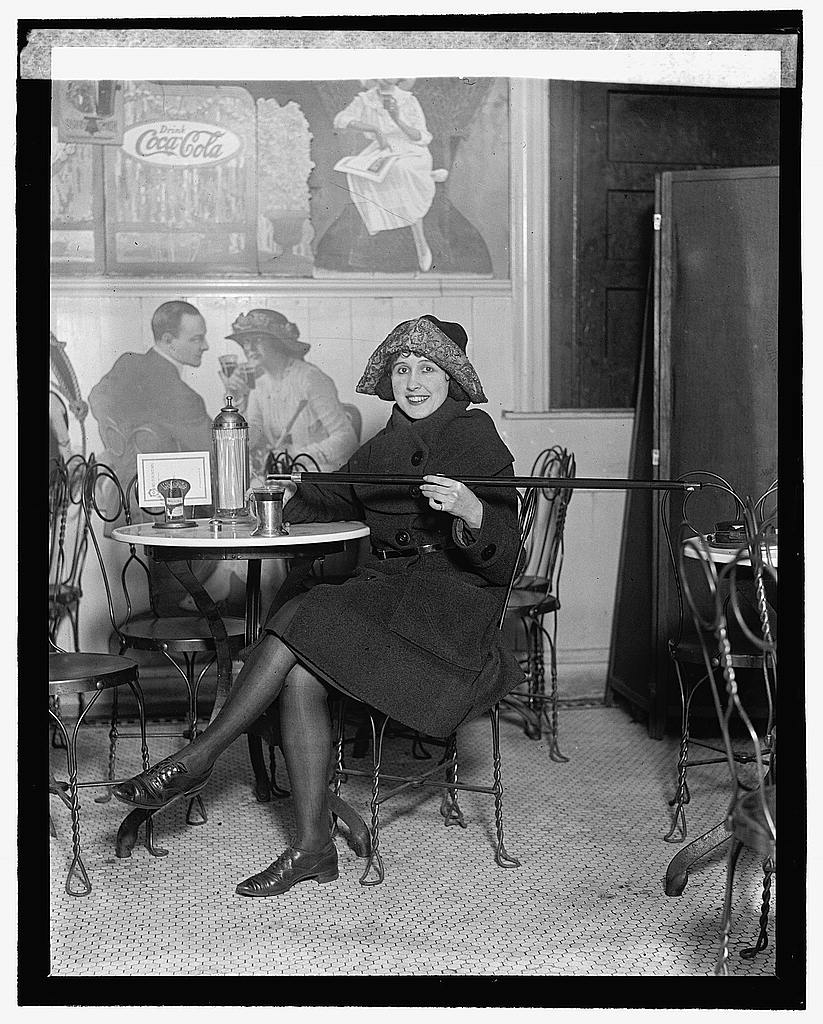 Woman seated at a soda fountain table is pouring alcohol into a cup from a cane, during Prohibition; with a large Coca-Cola advertisement on the wall 2/13/1922 via LOC, no known restrictions –>