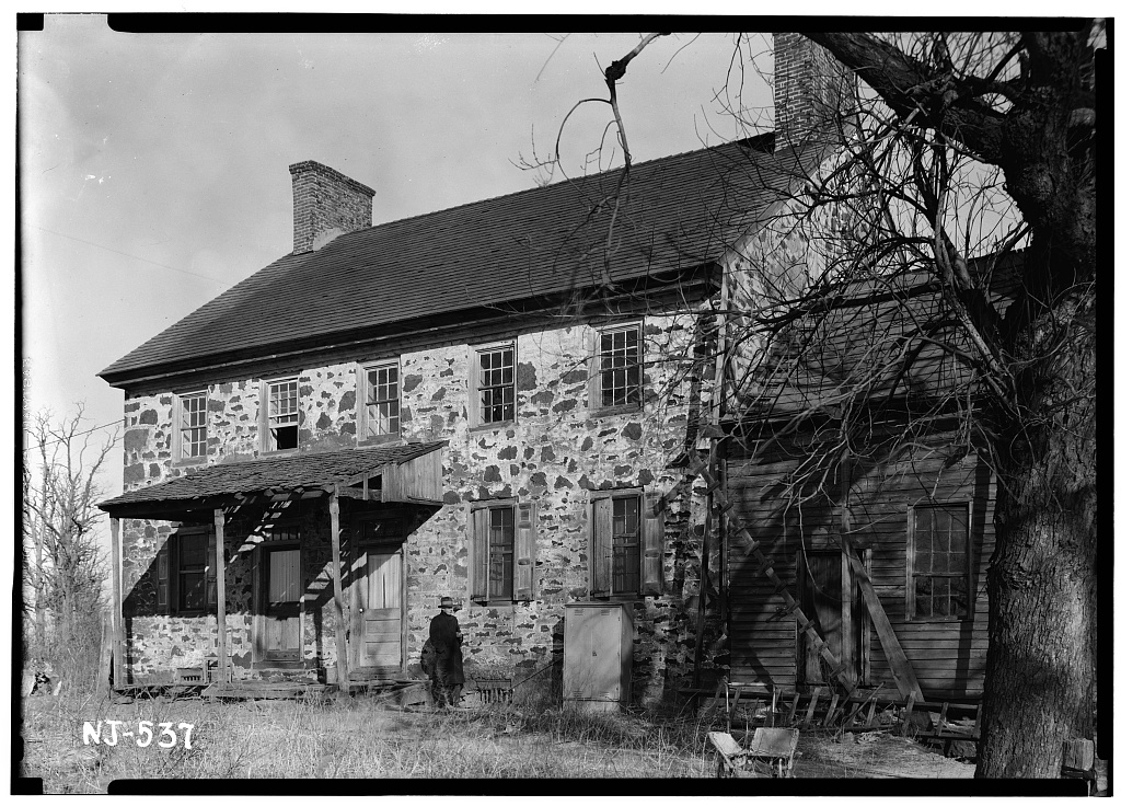 A photograph of the Joseph Hewlings House on Mount Laurel Road in Burlington County, New Jersey that was taken on February 13, 1939. Construction of the dwelling started in 1767, nine years before the signing of The Declaration of Independence. The home and 186 acres of property were granted to Joseph’s son Samuel in 1769. 17 years later, in 1786, Samuel sold the home and the land for 2,000 Pounds (Gold and Silver) to a farmer. Image via Wikimedia Commons, public domain –>