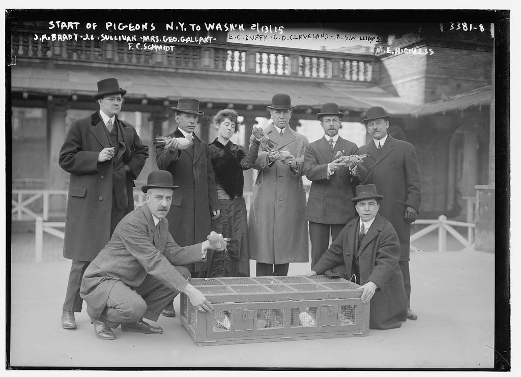 Start of pigeons NY to Washington February 13, 1915 Officials of the Poultry and Pigeon Show on the roof of Madison Square Garden in New York City, preparing to release pigeons carrying peace messages for President Wilson in Washington, D.C. Image via LOC, no known restrictions –>