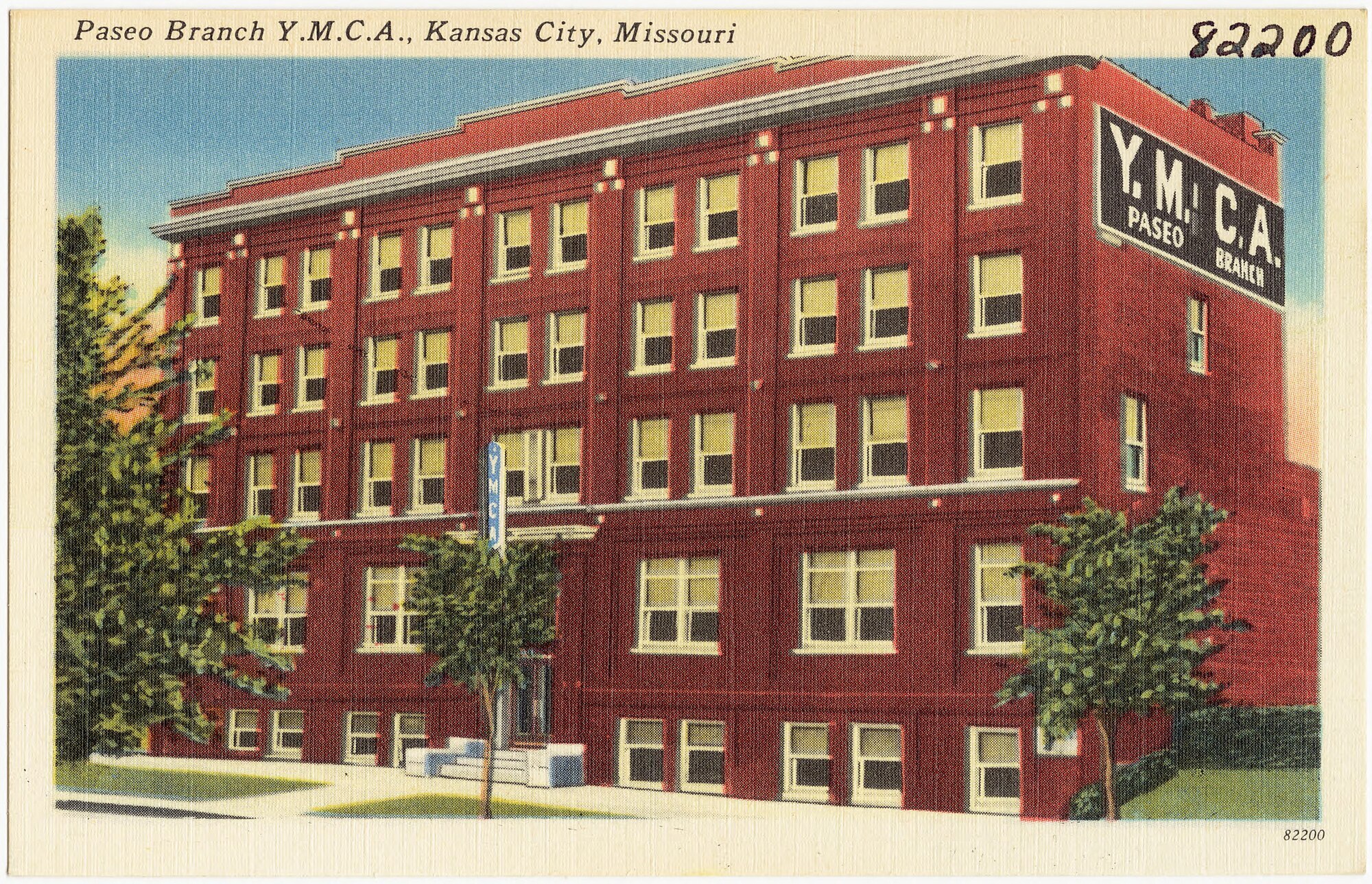 A postcard of the Paseo Branch Y.M.C.A. in Kansas City, Missouri. On February 13, 1920, eight owners of African American baseball clubs met at the Paseo Y.M.C.A. to form the Negro National League. The league lasted until 1931. Image via Wikimedia Commons, public domain –>
