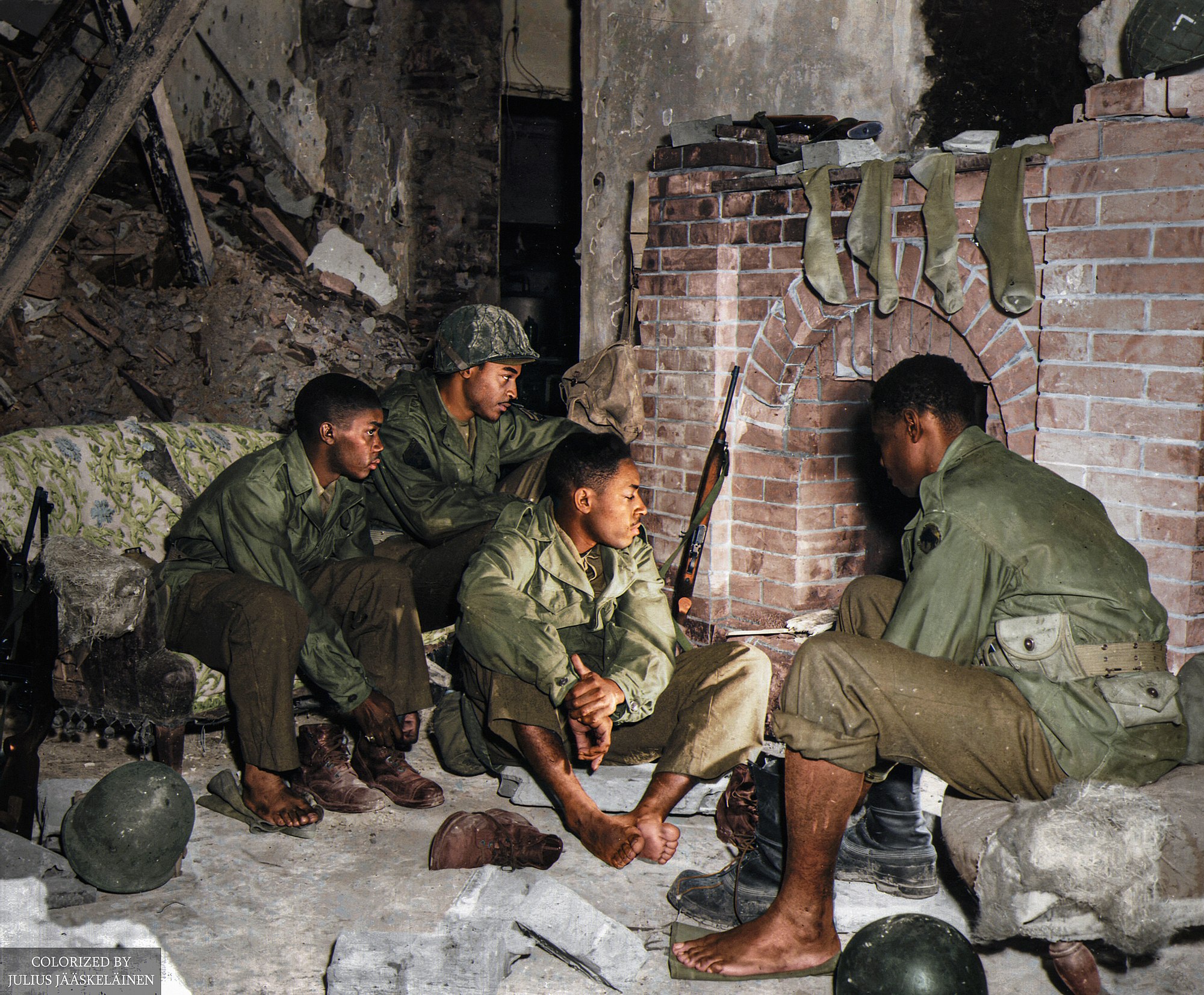 Members of the U.S. Army 92nd Infantry Division drying out in a bomb shattered house in Viareggio, Italy February 14, 1944 Image from Julius Jääskeläinen via Wikimedia Commons, CC BY 2.0 –>