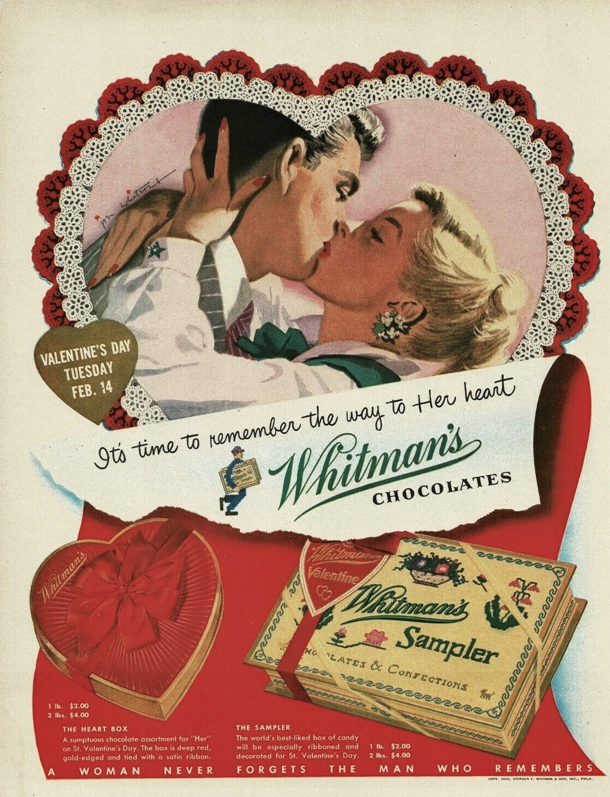 “It’s time to remember the way to Her heart.” Whitman’s Chocolates, 1950 via Wikimedia Commons, public domain –>