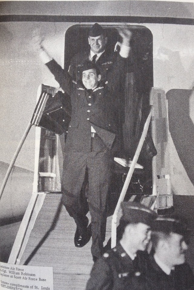Master Sergeant William “Bill” Robinson deplanes at Scott Air Force Base on February 14, 1973. Robinson was held captive at the Hanoi Hilton in Vietnam for nearly 7 & 1/2 years and was released just a few days earlier at the beginning of Operation Homecoming. Image via Wikimedia Commons, public domain –>
