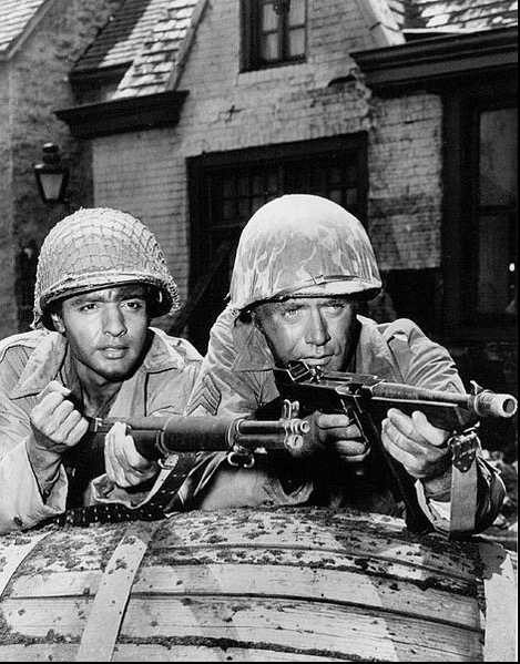 Vic Morrow, born February 14, 1929 made his film debut as a juvenile delinquent in “Blackboard Jungle” and appeared in “King Creole” with Elvis. He also had many television roles and starred as Sergeant Saunders in the 1960’s series “Combat!” He’s shown in that role (right) with guest star Sal Mineo. Image Wikimedia Commons, no known copyright, public domain in the US. –>