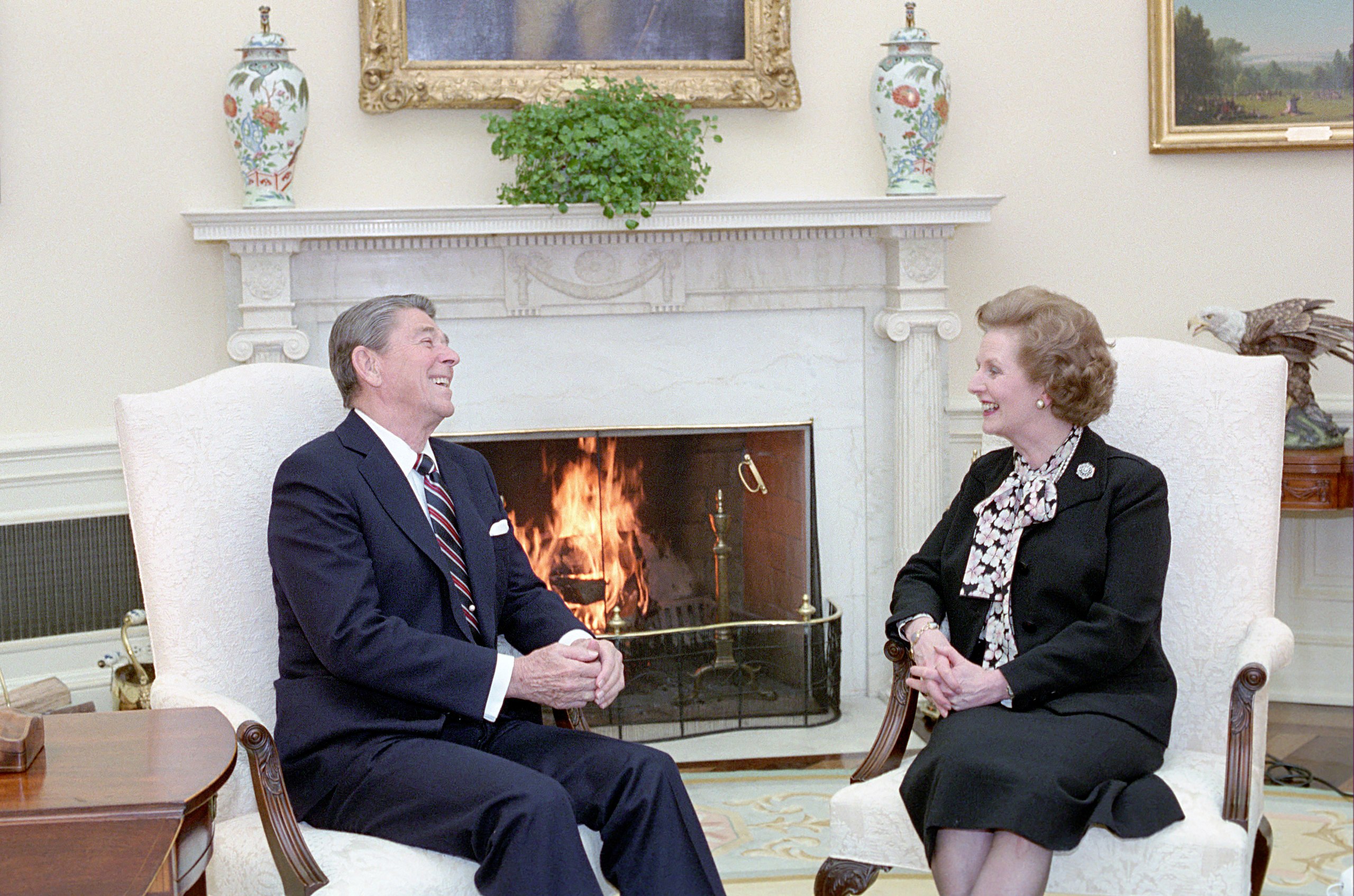 President Reagan during an Oval Office meeting and working visit of Prime Minister Thatcher of the United Kingdom. February 20, 1985 Image via LOC, no known restrictions –>