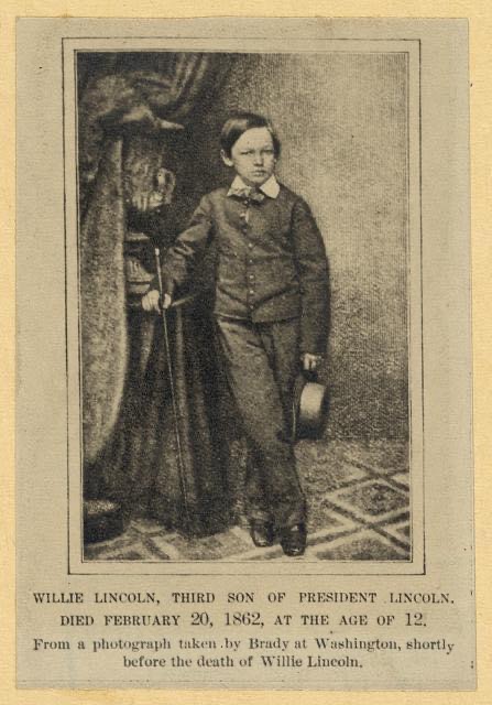“Willie Lincoln, third son of President Lincoln. Died February 20, 1862…” The early label on this image says that Willie was 12 years old at the time of his death. However, since Willie was born in December 1850 he was only 11 years old when he passed away. Image via LOC, no known restrictions –>