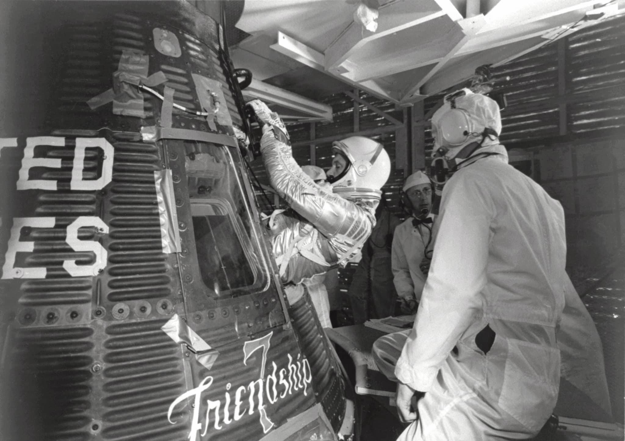 John Glenn entering Friendship 7 on February 20, 1962 when he became the first American to orbit the Earth. Image via Wikimedia Commons, public domain –>