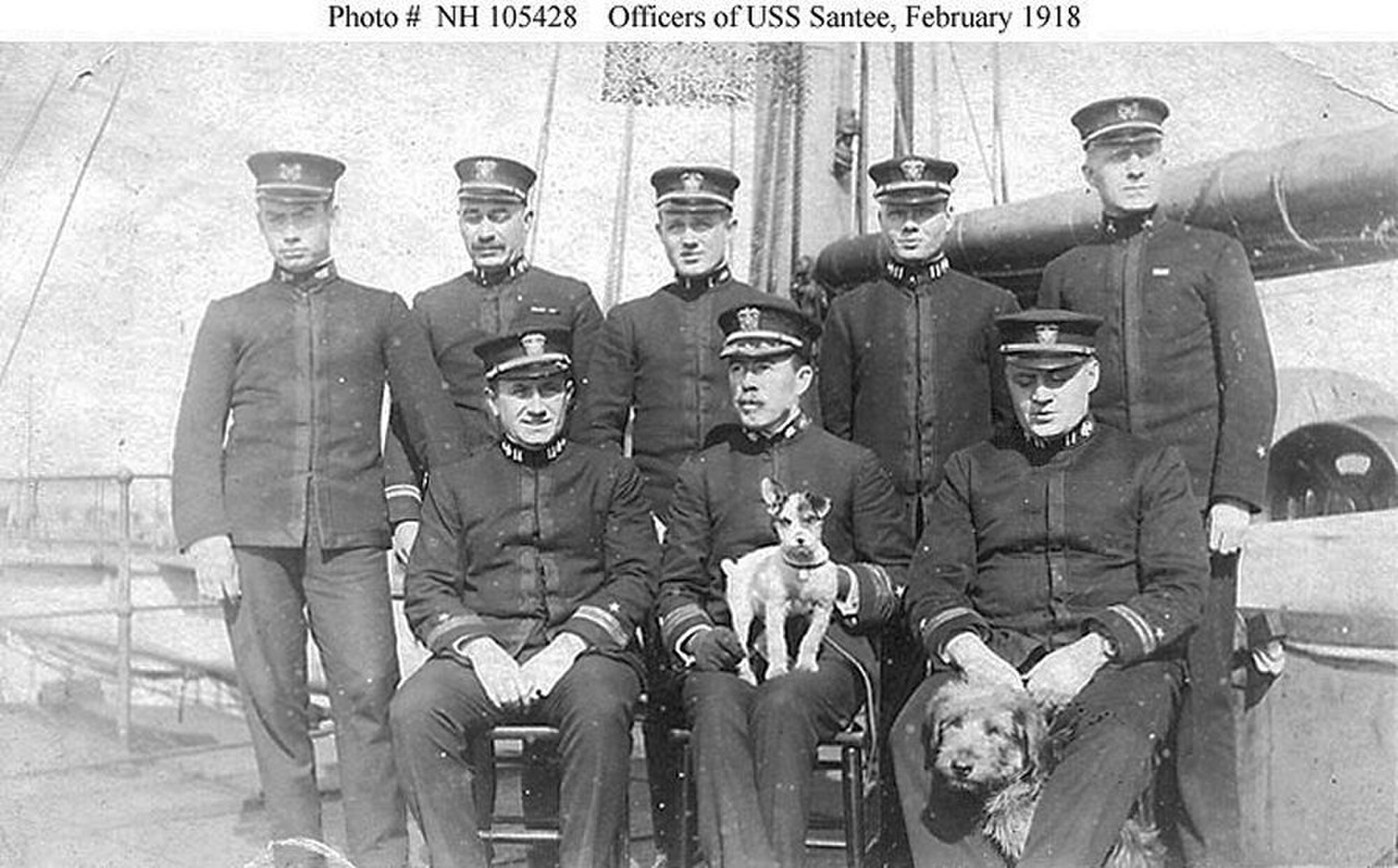 U.S. Navy officers in uniform of the USS Santee with mascot dogs at a dock in Devonport, England on February 20, 1918 –>