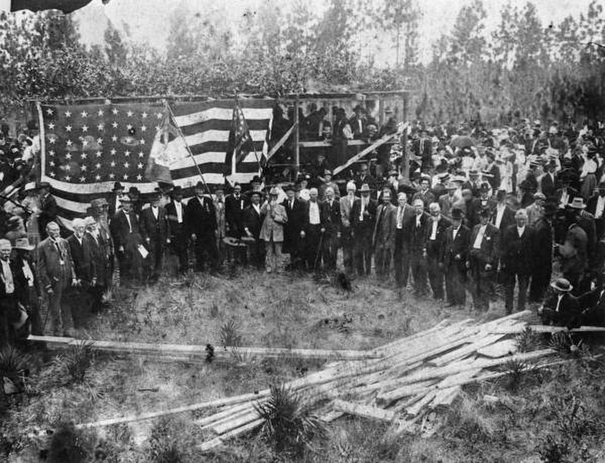 The largest Civil War battle that was fought in Florida occurred on February 20, 1864 in Olustee, Florida. Image: Survivors of the Battle of Olustee, gathered at the Monument dedication in 1912 from Florida Memory via Wikimedia Commons, public domain –>