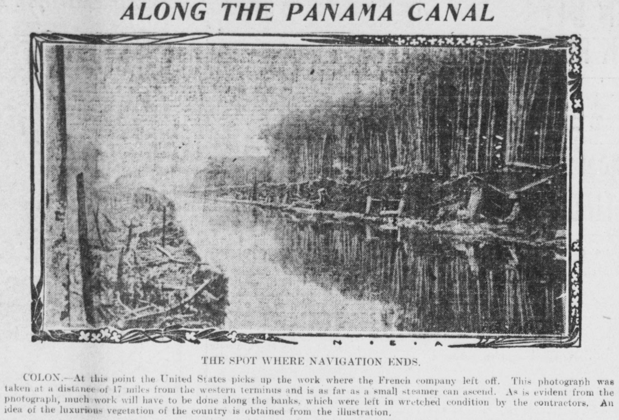 On February 23, 1904, the U.S. Senate ratified the Hay–Bunau-Varilla Treaty that was signed the prior November. The treaty allowed the U.S. to gain control of the Panama Canal Zone. Image from the Tacoma Times from 1904 showing the spot where navigation ended, about 17 miles from the western terminus via Wikimedia Commons, public domain –>
