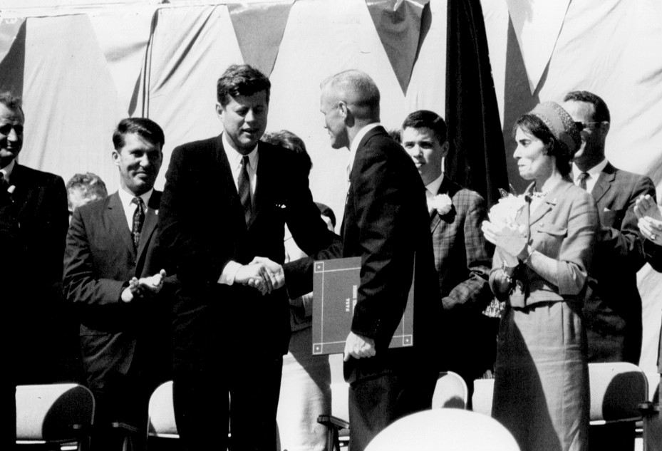 John Glenn receiving the Distinguished Service Medal from President John F. Kennedy at Cape Canaveral on February 23, 1962. Photo from NASA via Wikimedia Commons, public domain –>