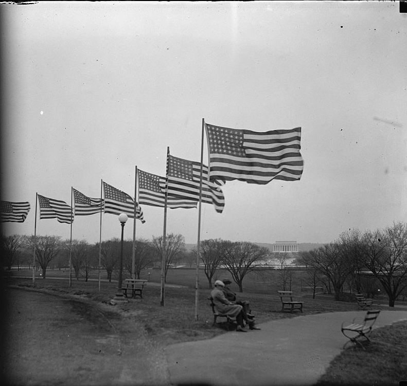 Flags at base of Washington Monument February 23, 1925 via Library of Congress, no known restrictions –>