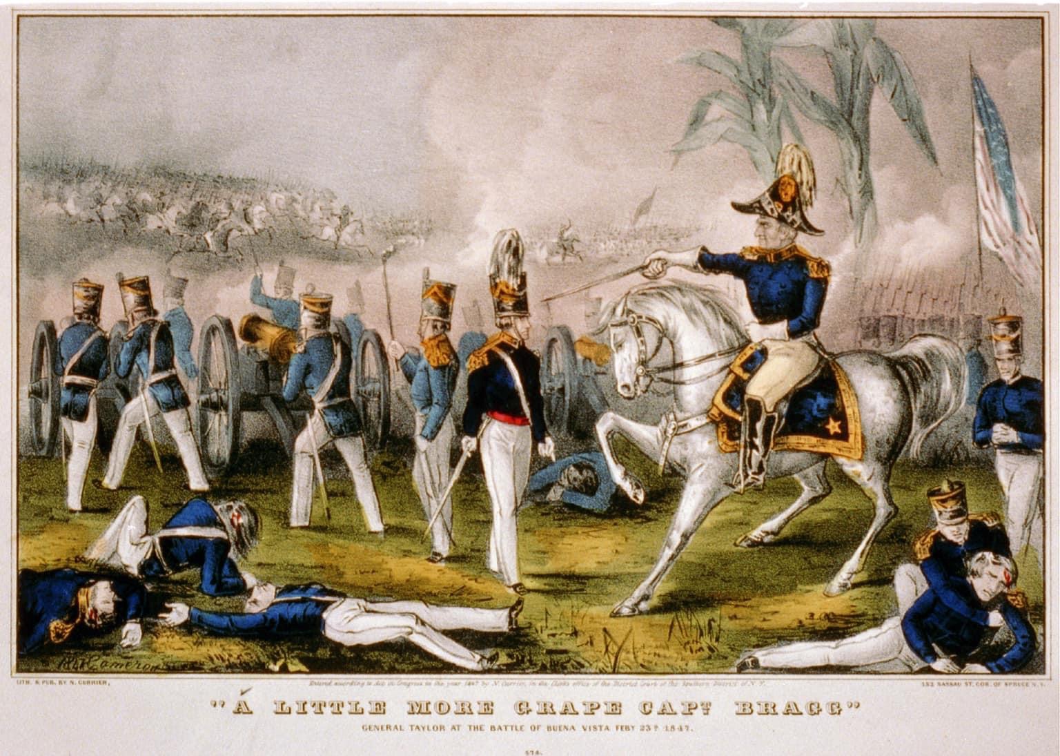 Zachary Taylor directing Captain Braxton Bragg to double his shot during the Battle of Buena Vista on February 23, 1847. Image via Wikimedia Commons, public domain –>
