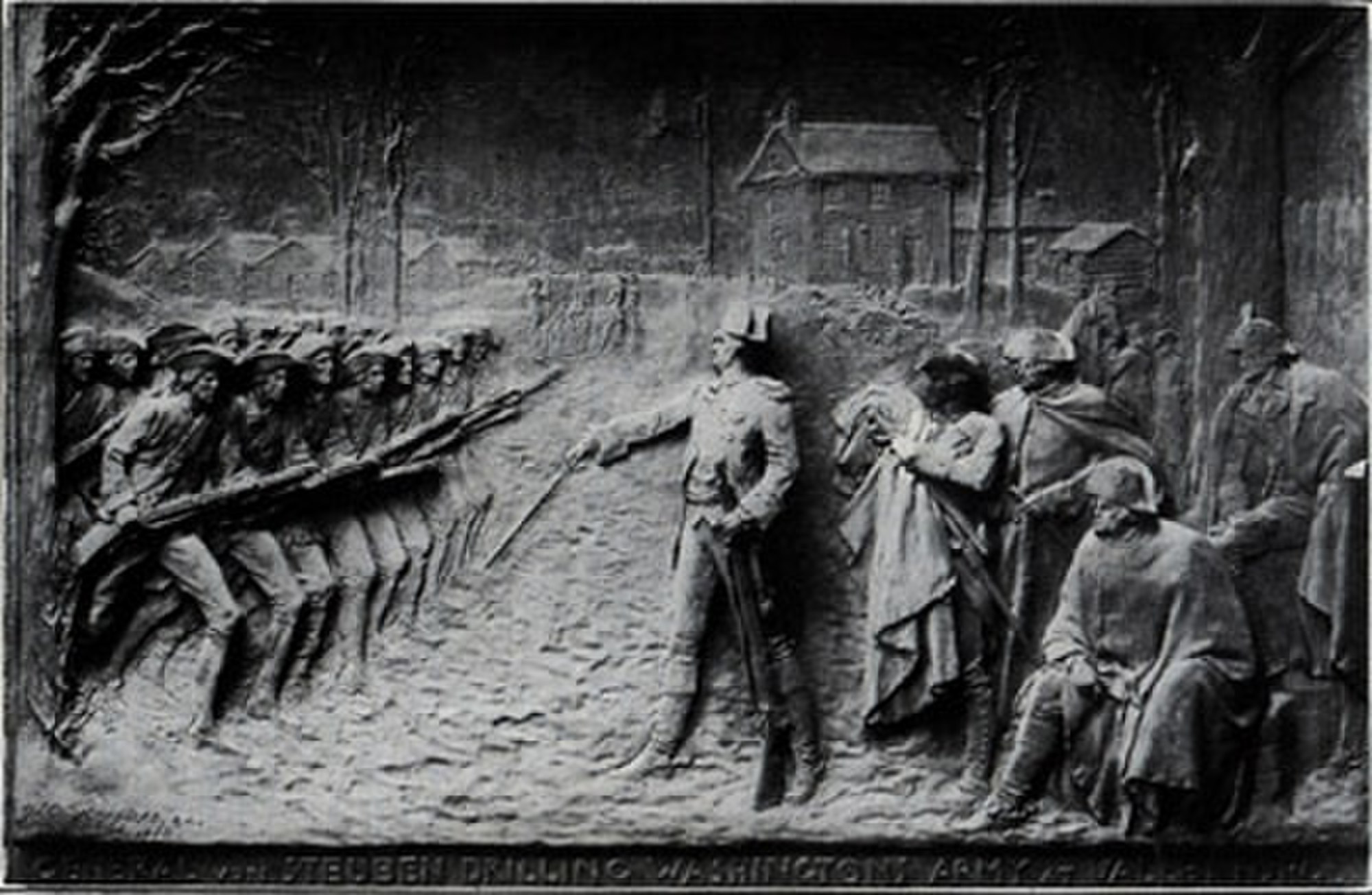 On February 23, 1778, Baron von Steuben arrived in Valley Forge to provide training and discipline to Washington’s Continental Army. Baron von Steuben remained with the Americans throughout the rest of the Revolution. He became an American Citizen and received land in New York State. Image via Wikimedia Commons, public domain –>