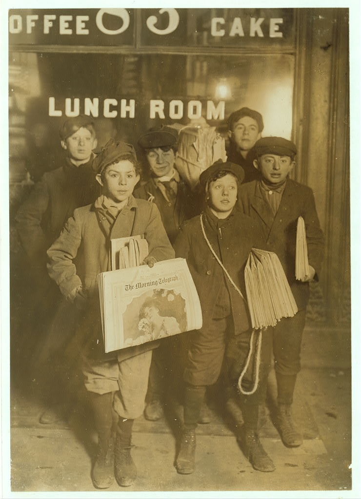 3 A.M. Sunday, February 23rd, 1908. Newsboys (who were seen) selling on Brooklyn Bridge. Image via LOC, no known restrictions –>