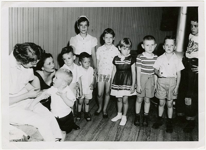 On February 23, 1954, the polio vaccine developed by Dr. Jonas Salk began to be administered to school children in Pittsburgh, Pennsylvania. Salk vaccinated his own children a year before the “polio pioneers” mass inoculation program. Shown are children receiving the vaccine in Mississippi in 1956. Image from MS Dept. of Archives and History via Flickr, no known copyright. –>