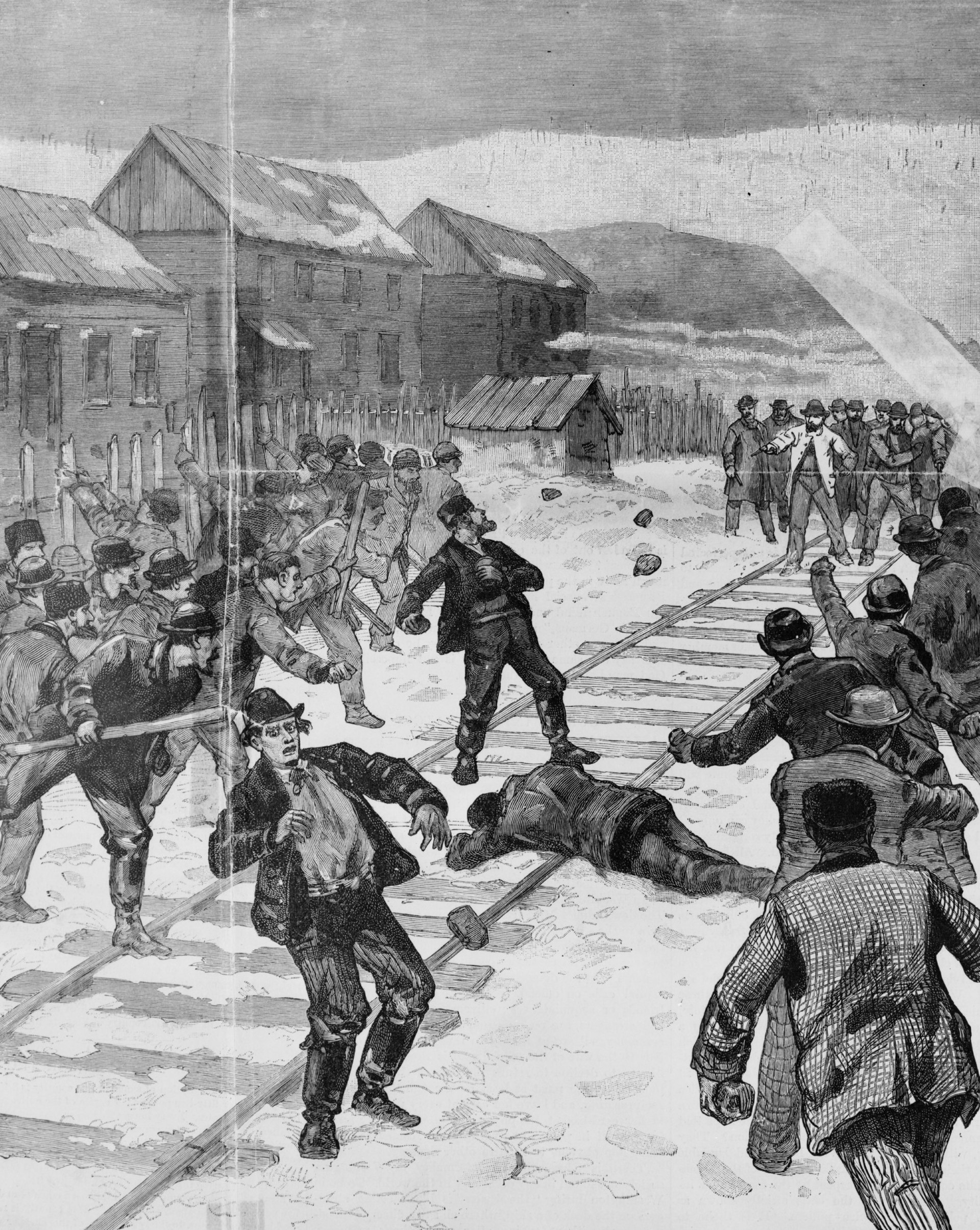 Pennsylvania – the mining troubles in the Schuylkill region – attack on the coal and iron police by a mob of strikers, at Shenandoah, February 3, 1888. Image via Wikimedia Commons, public domain –>
