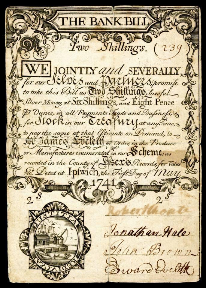 February 3, 1690 is considered to be the date when The Colony of Massachusetts Bay released the first paper currency in America Image: Colonial currency from the Province of Massachusetts Bay from 1741 via Wikimedia Commons, public domain –>
