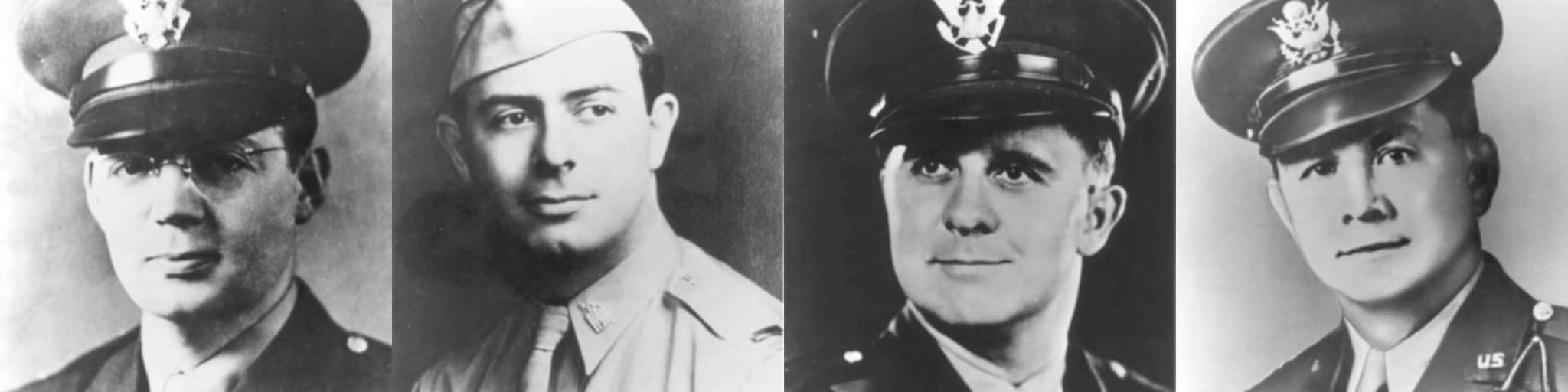 February 3, 1943 – the SS Dorchester is torpedoed in freezing waters. With life jackets in short supply four Army chaplain lieutenants (as shown left to right in the image collage below) Father John Washington, Rabbi Alexander Goode, Rev. Clark Poling, and Rev. George Fox unhesitatingly give their life jackets to other soldiers and pray together as the ship sinks. “Greater Love Hath No Man…” Images of The Four Chaplains via Wikimedia Commons, public domain –>
