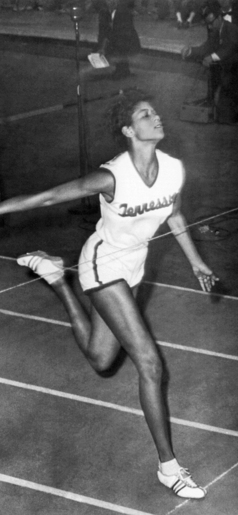 February 3, 1961 Tennessee State track star and winner of three Olympic gold medals Wilma Rudolph ties her 60 yard world indoor record at the Millrose Games in Madison Square Garden. Image via Alamy –>