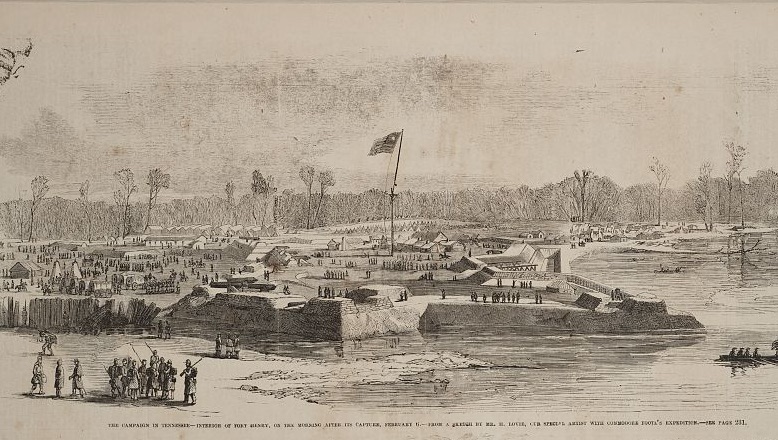 “At eleven o’clock in the morning of the 6th, General Grant moved with his command, and at the same time Commodore Foote steamed up the river with his fleet in two divisions. The first was of ironclads, the Cincinnati, flag-ship, the Carondelet, and the St. Louis, each carrying thirteen guns, and the Essex, carrying nine guns. The second division of three wooden boats, under command of Lieutenant Phelps, followed half a mile astern. At a quarter before twelve o’clock the first division opened fire with their bow-guns at a distance of seventeen hundred yards, and continued firing while slowly advancing to a distance of six hundred yards from the fort. Here the four boats took position abreast, and fired with rapidity. Lieutenant Phelps’ division sent shells falling within the work. The little garrison replied with spirit. Fifty-nine shots from their guns struck the fleet, but most of them rebounded without doing harm. One shot exploded the boiler of the Essex, scalding twenty-eight officers and seamen, including Commander Porter. One seaman was killed and nine wounded on the flag-ship, and one was killed by a ball on the Essex. In the fort, the twenty-four pound rifled gun exploded, disabling every man at the piece In the fort, a shell from the fleet, exploding at the mouth of one of the thirty-two pounders, ruined the gun, and killed or wounded all the men serving it. A premature, explosion at a forty-two pounder killed three men and wounded others. A priming-wire accidentally spiked the ten-inch columbiad. Five men were killed, eleven wounded, and five missing. Four guns were disabled. The men were discouraged.” Source: From Fort Henry to Corinth by M.F. Force, published in 1881 https://archive.org/details/fromforthenrytoc00forcuoft/page/30/mode/1up?goal=0_fd7f07f486-1f9d03e689-&mc_cid=1f9d03e689 Source says not in copyright Image: The campaign in Tennessee – Interior of Fort Henry, on the morning after its capture, February 6, 1862 from a sketch by Mr. H. Lovie, special artist with Commodore Foote’s expedition via LOC, no known restrictions –>