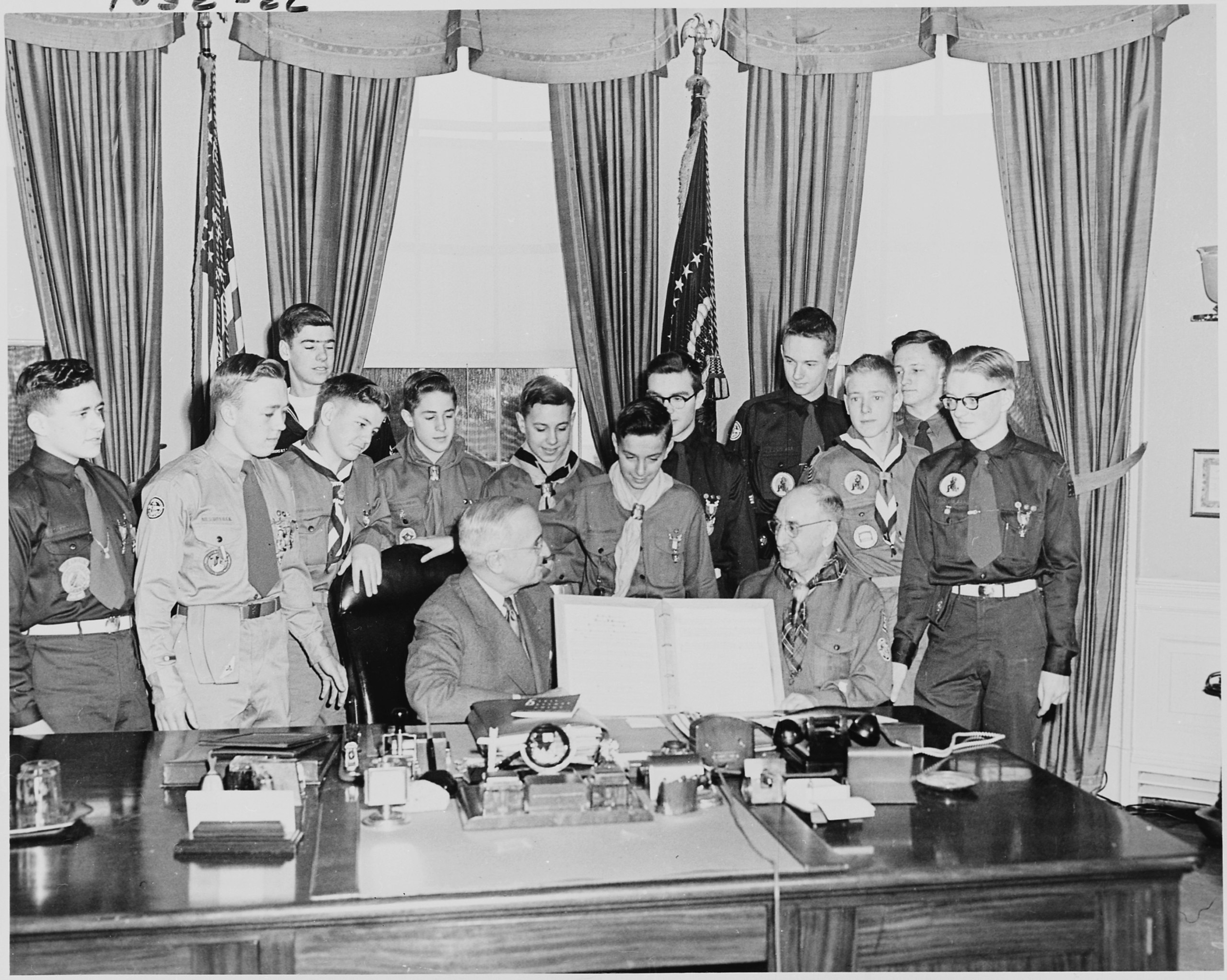 President Truman in the Oval Office, receiving a report on the accomplishments of the Boy Scouts from a delegation of Eagle Scouts, in recognition of Boy Scout Week. February 6, 1951 Image via Wikimedia Commons, public domain –>