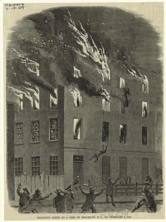 Shocking scene at a fire in Brooklyn, N.Y., on February 6, 1859 An engraving that appeared in Harper’s Weekly Image via NYPL Digital Collections, no known restrictions –>