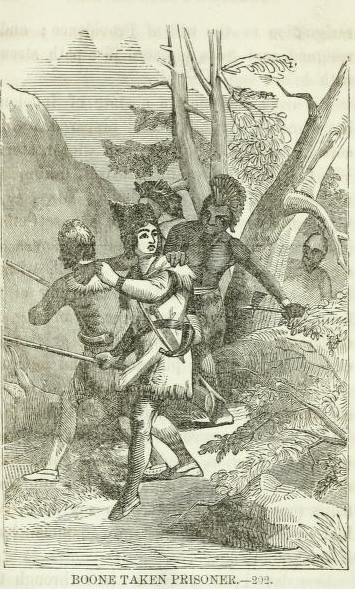 “Toward evening of the seventh of February (1778) he was returning home from a wide circuit with his packhorse laden with buffalo-meat and some beaver-skins, for he had many traps in the neighborhood. A blinding snow-storm was in progress, which caused him to neglect his usual precautions, when suddenly he was confronted by four burly Shawnese, who sprang from an ambush. Keen of foot, he thought to outrun them, but soon had to surrender, for they shot so accurately that it was evident that they could kill him if they would. The prisoner was conducted to the Shawnese camp, a few miles distant. There he found a hundred and twenty warriors under Chief Black Fish. Two Frenchmen, in English employ, were of the party; also two American renegades from the Pittsburg region, James and George Girty. These latter, with their brother Simon, had joined the Indians and, dressed and painted like them, were assisting the tribesmen of the Northwest in raids against their fellow-borderers of Pennsylvania and Virginia. Boone was well known by reputation to all these men of the wilderness, natives and white men alike; indeed, he noticed that among the party were his captors of eight years before, who laughed heartily at again having him in their clutches.” From: Daniel Boone by Reuben Gold Thwaites, published in 1902 https://archive.org/details/danielboone01hwa/page/147/mode/1up Source says not in copyright Image: Daniel Boone taken prisoner –>