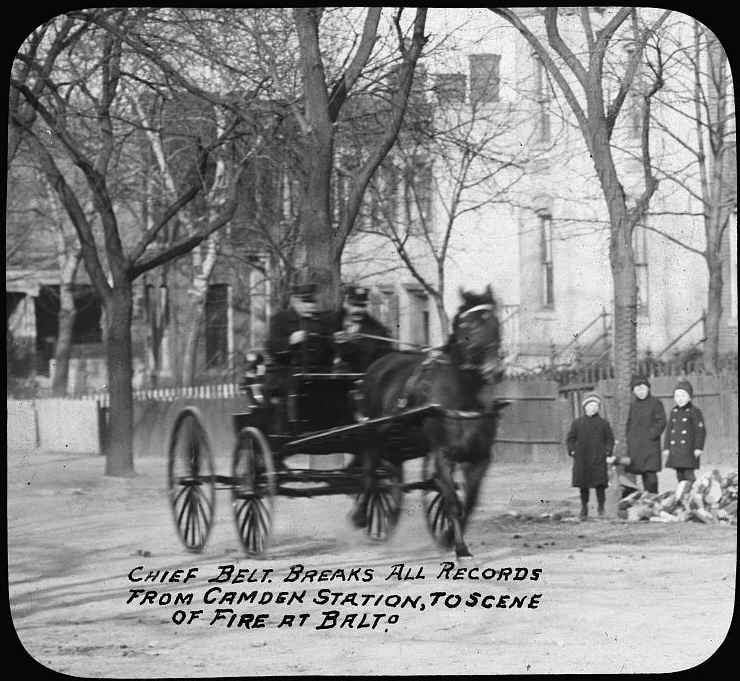 On February 7,1904, the Great Baltimore Fire began which destroyed much of Central Baltimore including over 1,500 buildings. Image of Chief Belt from Camden Station rushes to scene of fire at Baltimore in 1904 via Wikimedia Commons, public domain –>