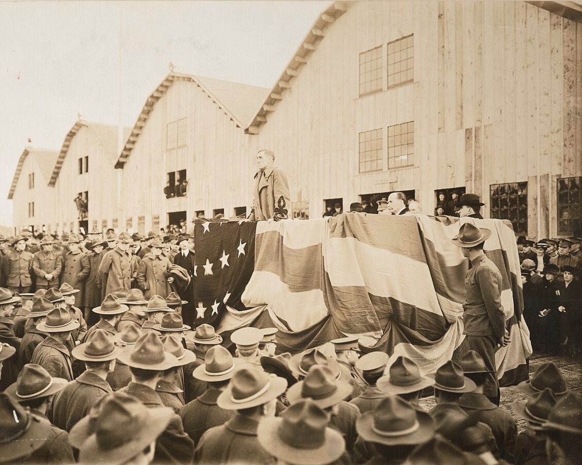 Brigadier General Disque speaking at the opening of spruce mill operations at Fort Vancouver on February 7, 1918. Mayors of Vancouver and Portland at right of stand Spruce wood from the mill was used in the fabrication of military air craft during WWI. Image via Wikimedia Commons, public domain –>