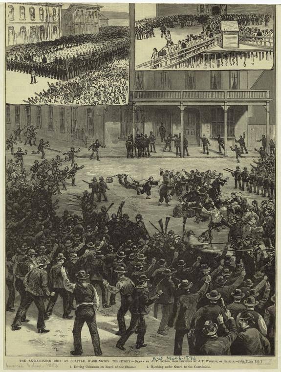 On February 7, 1886 Federal soldiers were ordered to put an end to rioting inflicted upon Chinese immigrants in Seattle, Washington Territory. Image via NYPL Digital Collections, no known restrictions –>