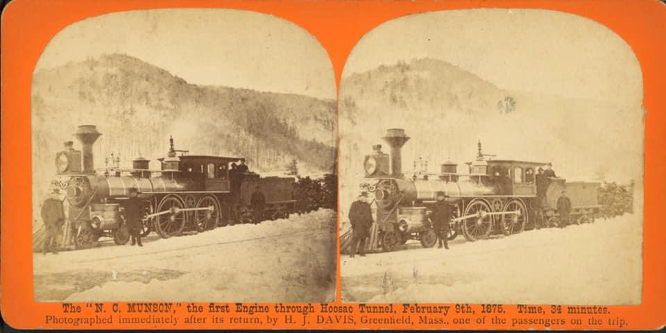 “N.C. Munson,” first engine through Hoosac tunnel, February 9, 1875. The Hoosac Tunnel is in Western Massachusetts near the Vermont border. via Wikimedia Commons, public domain –>