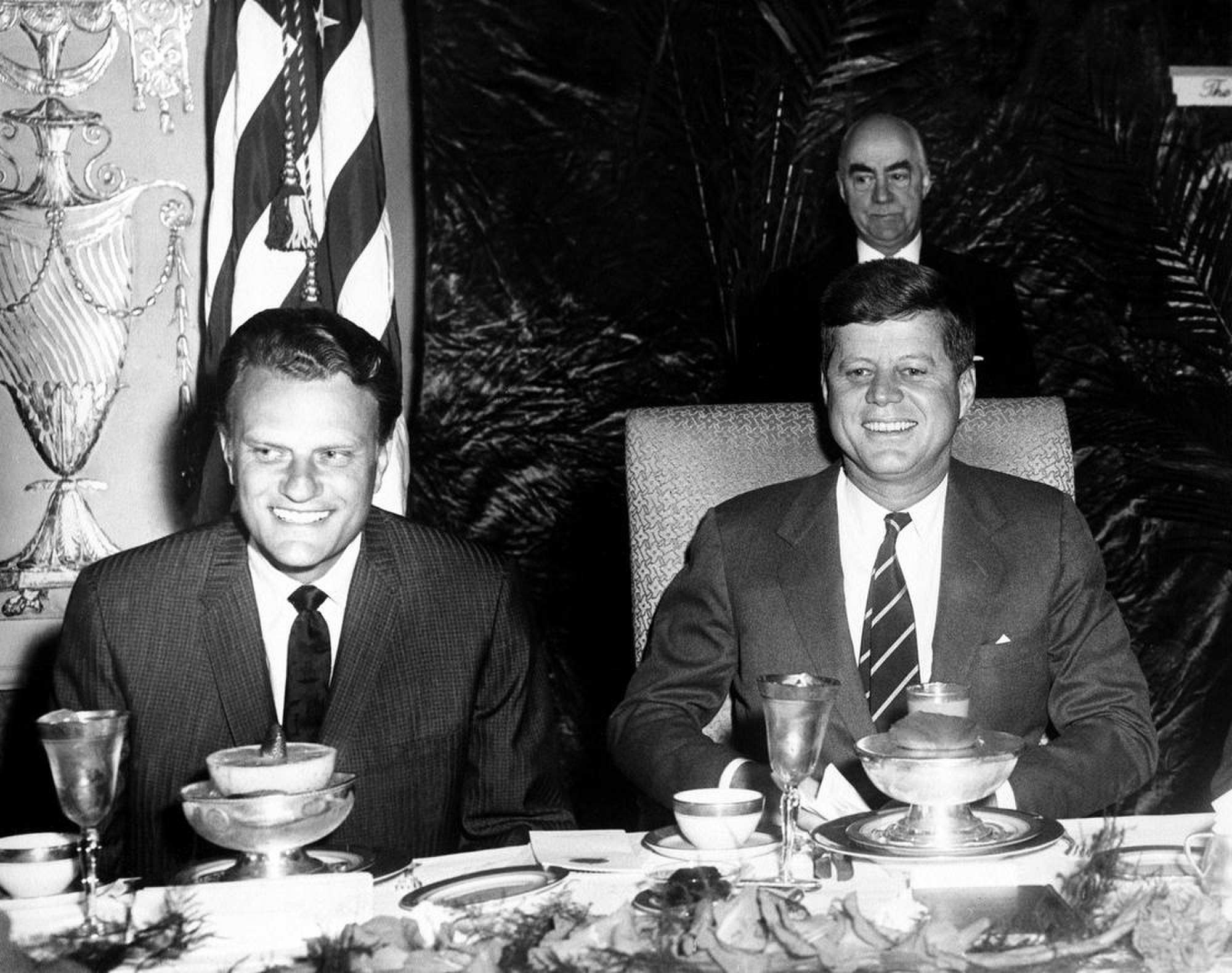 President John F. Kennedy and Billy Graham at a prayer breakfast at the Mayflower Hotel in Washington, D.C. February 9, 1961 Image via Wikimedia Commons, public domain –>