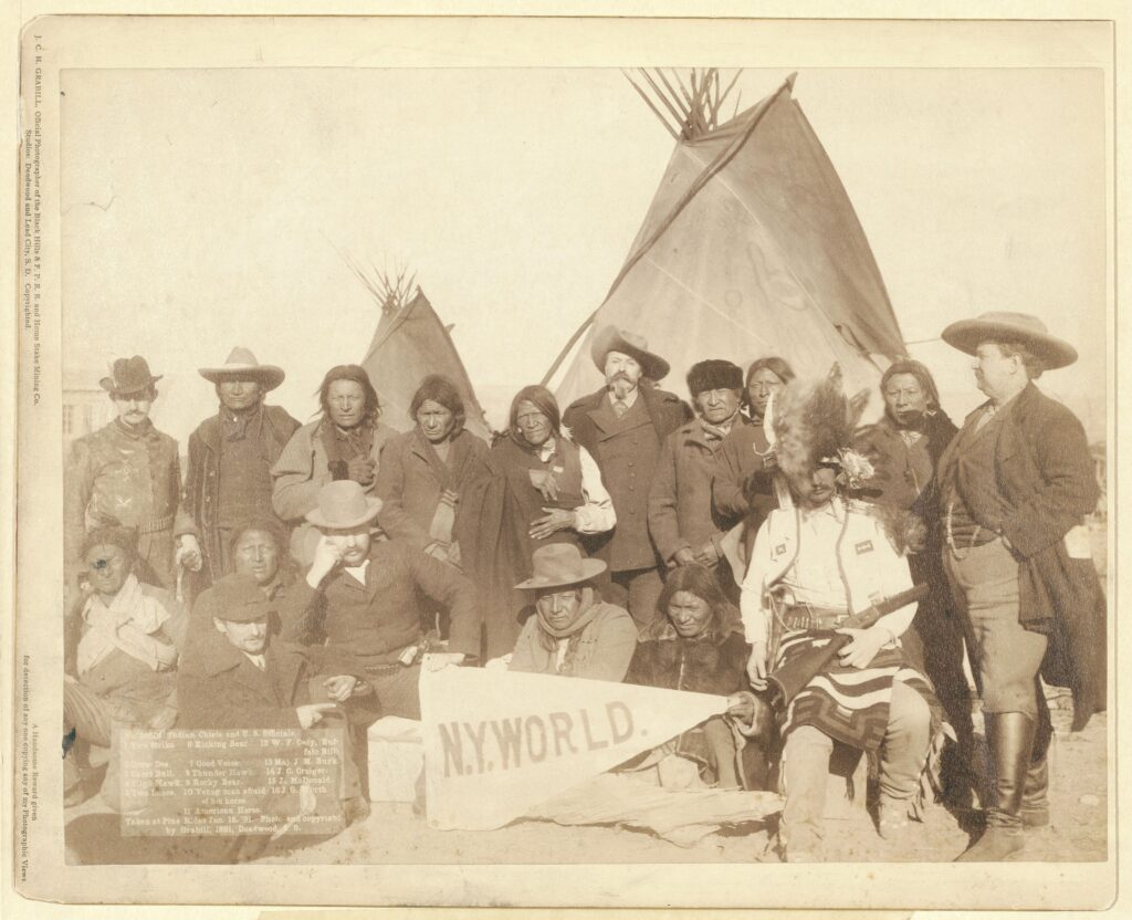 Taken just weeks after the Wounded Knee Massacre, this January 16, 1891 photograph gathers Lakota leaders—Kicking Bear, Short Bull, Crow Dog, American Horse, and others—alongside U.S. officials and Buffalo Bill Cody’s entourage at Pine Ridge. Tipis stand behind them. A banner for the New York World lies at their feet. It is a moment of reckoning: diplomacy, survival, and spectacle converging in the shadow of tragedy. Some would join Cody’s Wild West show. Others would return to fractured homelands. All stood in the aftermath of a world forever changed.