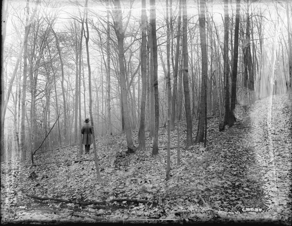 Mine Brook, New Jersey, January 17, 1919. In the winter woods above the small Somerset County hamlet, a lone railroad surveyor stands among bare trees, part of a Delaware, Lackawanna & Western Railroad engineering study. Though no tracks appear in the frame, this landscape shaped the railroad’s fate: the wooded slopes and ravines around Far Hills and Bernards Township were notorious for runoff, shifting soil, and seasonal washouts. Early railroad engineers walked these hillsides on foot, documenting drainage, boundaries, and terrain long before modern mapping.