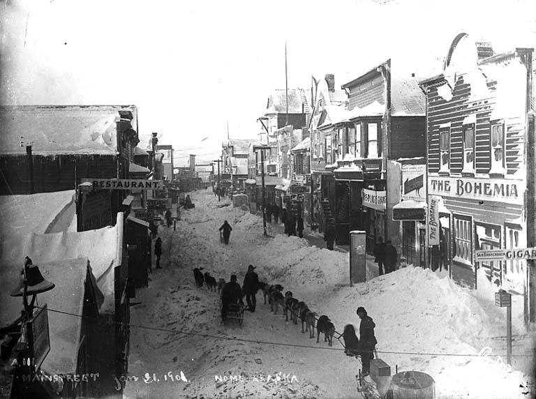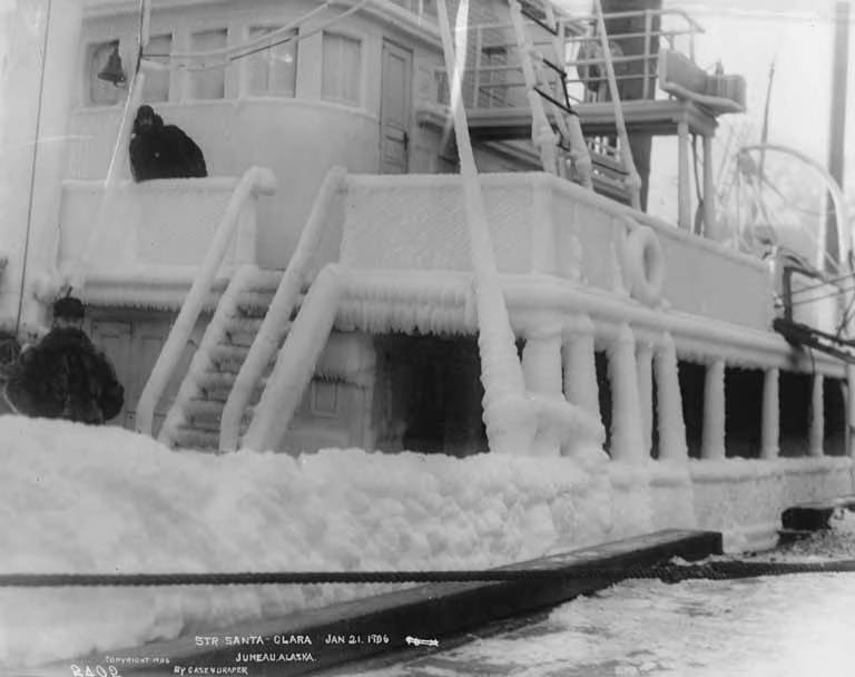 Two men in fur coats on the ice-covered steamer Santa Clara, in Juneau, Alaska, January 21, 1906