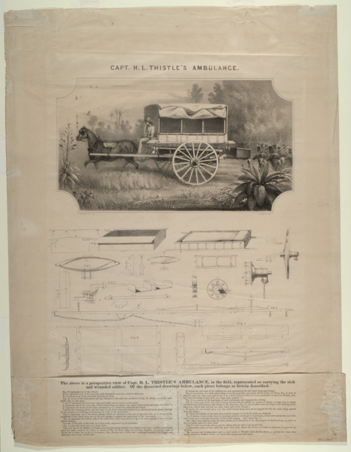 Though the original patent drawing survives only in the National Archives, Thistle’s later two‑wheeled ambulance wagon — preserved today in a Smithsonian lithograph (shown) — shows that he was exploring multiple approaches to battlefield evacuation, from horse‑mounted litters to wheeled transport.