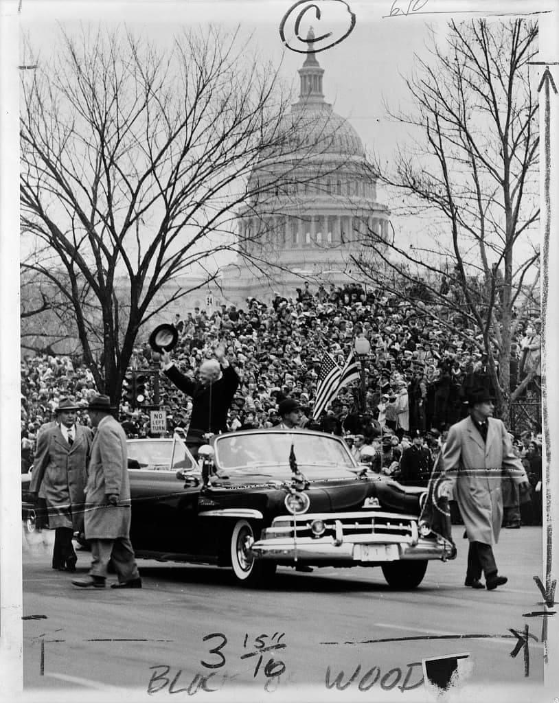 President Dwight D. Eisenhower waves to the crowds lining the parade route near the U.S. Capitol during his second inaugural parade on January 21, 1957.