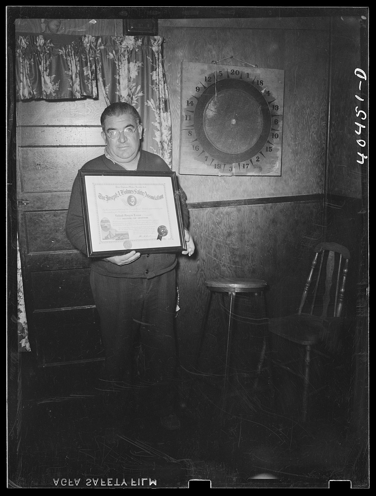 Gilberton, Pennsylvania. Richard Evans, in a barroom, exhibiting a testimonial to his uncle who saved some G-men from a gas explosion and was killed, January 21, 1935, in a Gilberton colliery.