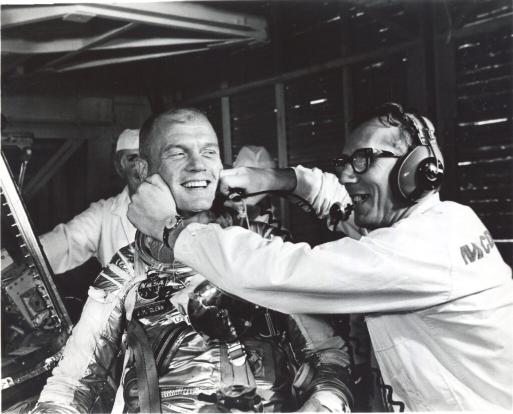 Guenter Wendt, the original pad leader for NASA’s manned space program, coaxes a smile out of astronaut John Glenn after the Mercury‑Atlas 6 launch attempt was scrubbed on January 27, 1962. Known for his meticulous standards and dry humor, Wendt was the last person the astronauts saw before liftoff — a steady presence in moments of tension and uncertainty.