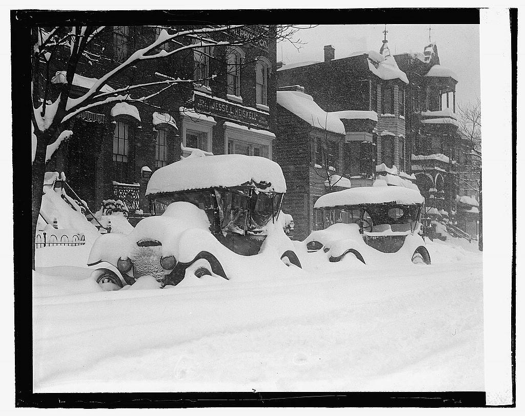 Photo of snow covered automobiles from the Knickerbocker blizzard that was taken on January 28, 1922.